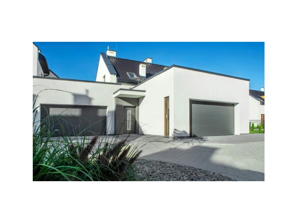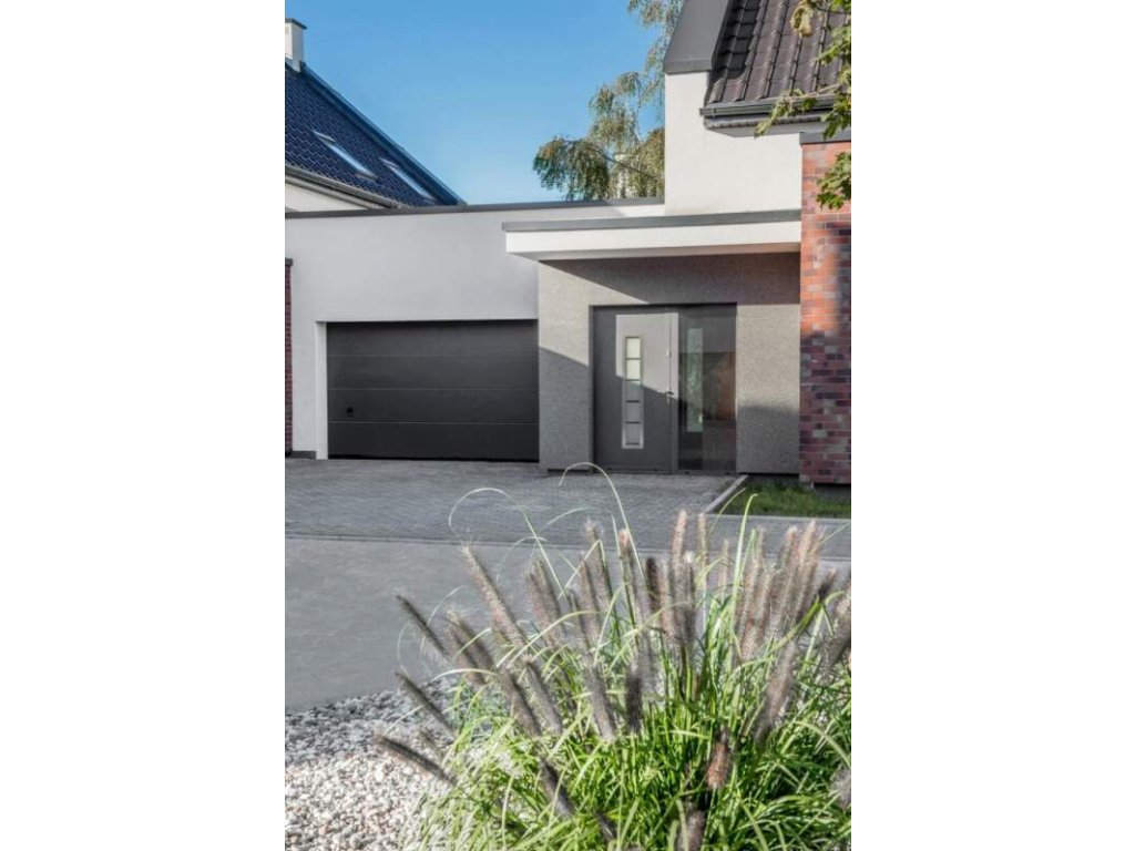Moderní sekční vrata s hladkým panelem bez prolisu, která nabízí čistý design a spolehlivý provoz díky automatickému ovládání MOTO io. Ideální volba pro ty, kteří hledají kombinaci estetiky a technologie.